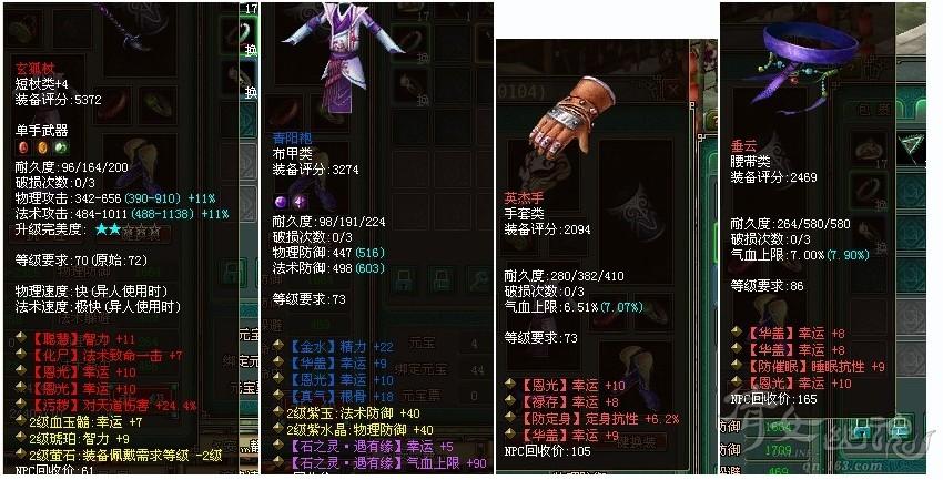 这个星期留意易市有没带洞的玄狐杖 73紫杖和剑。 红杖50万以下 买掉。 紫的150万左右 不要犹豫速秒,你不识货 放心 有人识货 以后这玩意你总要用到的。还有这个星期有点资本了 看见+5 +6的心 6的心50万都算合理 5的15万也可以买 ,买吧 不要心疼 这东西后面难收的。320幸运配置。 我上个图吧 只有一半了。。
