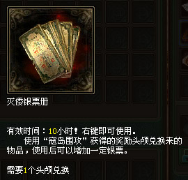 绑定 | 可以通过倭寇头颅换取的道具,使用后根据等级奖励银票,有效时间为10小时。 |