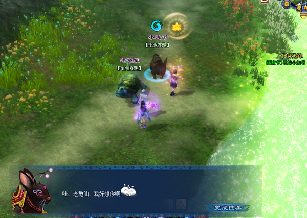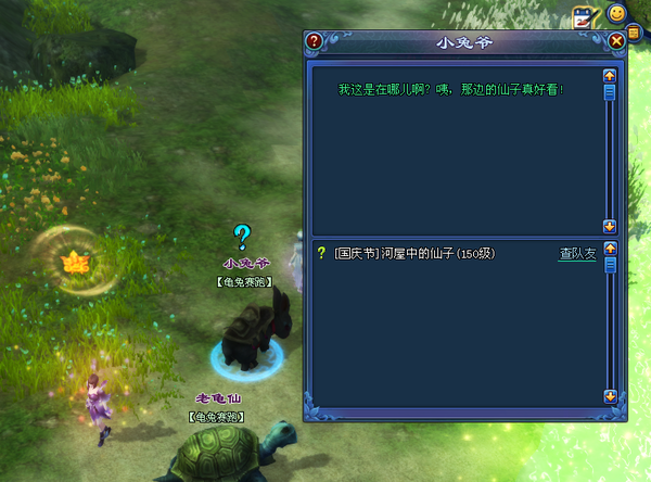 乌龟NPC处领取寻找【小兔爷的任务】,当所有的队员都领取了以后,记得需要点击【出发去找小兔爷】这个选项,我们才可以走,否则是走不出去的,这个是重点,也是难点,可能有很多玩家都不知道,然后一直在转圈圈,说怎么出不去啦,这是怎么回事呀?