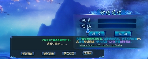 立即充值50元(500点倩女专用点数,充值的赠点不算在内),点击排队界面的“秒进通道”按钮,即刻轻松秒进游戏。充值后24小时内,该玩家都可以重新进入秒进通道。